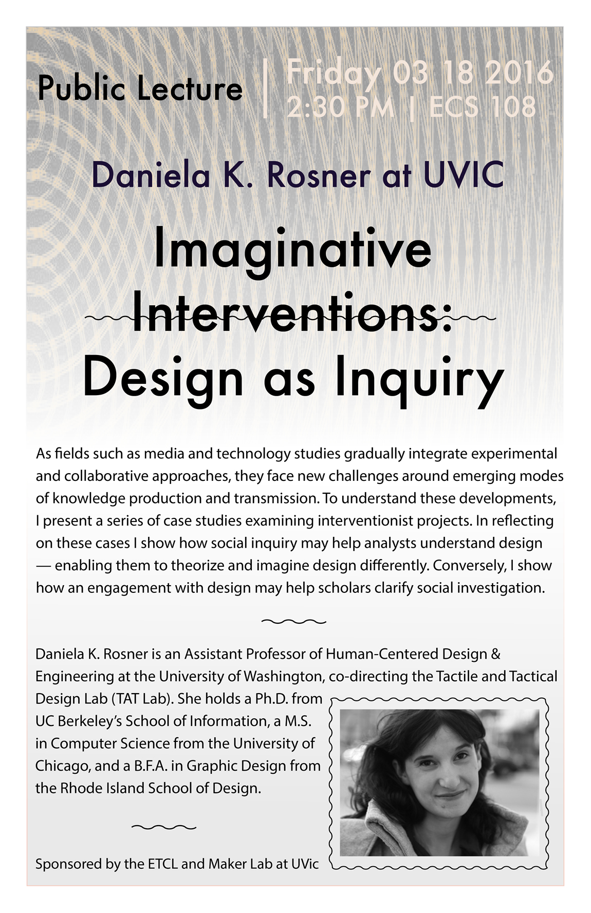 Lecture: Daniela Rosner, "Design as Inquiry" In partnership with the Electronic Textual Cultures Lab, the MLab[...] continue reading →