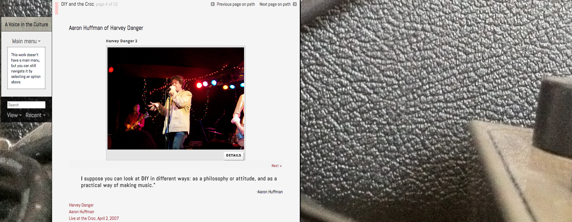 Screengrab of the Crocodile Cafe Exhibit, which features audio of an interview with Ian MacKaye. Interview conducted by Jentery Sayers at the Dischord House.