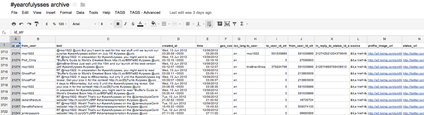 The research leads for this project were Stefan Krecsy, Stephen Ross, and Jentery Sayers. Organized largely by the Modernist Versions Project (MVP) and its director, Stephen Ross, Year of Ulysses (YoU) involved well over fifty contributors, all of whom are listed on the MVP’s website, which was originally designed by Clea Cosmann with support from the MLab. During the initiative, the MLab maintained and visualized data gathered from YoU-related communications, and it provided the MVP with basic infrastructure support. In and beyond the MLab, Amanda Hansen facilitated all lectures, Twitter chats, communications, and research related to the initiative. YoU would not have been possible without support from the Social Sciences and Humanities Research Council (SSHRC), the University of Victoria’s Work Study Program, and the University of Tulsa’s McFarlin Library.