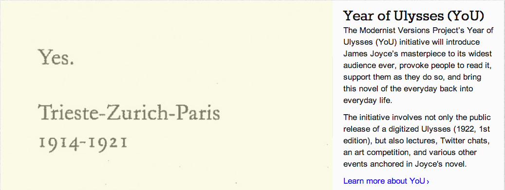 In collaboration with the MLab, the Modernist Versions Project’s Year of Ulysses (YoU) initiative introduced James Joyce’s novel to a wide audience, provoked people to read it, supported them as they did, and brought this account of the everyday back into everyday life. Thanks to the remarkable efforts of MVP associates, Patrick Belk and Matthew Kochis (both at the University of Tulsa), as well as the generosity of the McFarlin Library, the MVP now owns high-quality scans of the first edition of Ulysses as it was published in February 1922 by Sylvia Beach’s famed Shakespeare & Company bookstore. In the spirit of the Liberate Ulysses movement and in honour of the 90th birthday of Joyce’s masterpiece, the MVP and the MLab serially published these scans online—just as Ulysses was originally serialized in the pages of the Little Review—and provided a robust framework for (re)discovering the novel. YoU involved not only the public release of these scans but also lectures, Twitter chats, an art competition, and various other events anchored in Joyce’s novel.