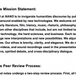 COPYRIGHT AND PERMISSIONS: NANO expects that all submissions contain original work, not extracts or abridgements. Authors may use their NANO material in other publications provided that NANO is acknowledged as the original publisher. Authors are responsible for obtaining permission for reproducing copyright text, art, video, or other media. As an academic, peer-reviewed journal, whose mission is education, Fair Use rules of copyright apply to NANO. Please send any questions related to copyright and permissions to editor.nanocrit@gmail.com.