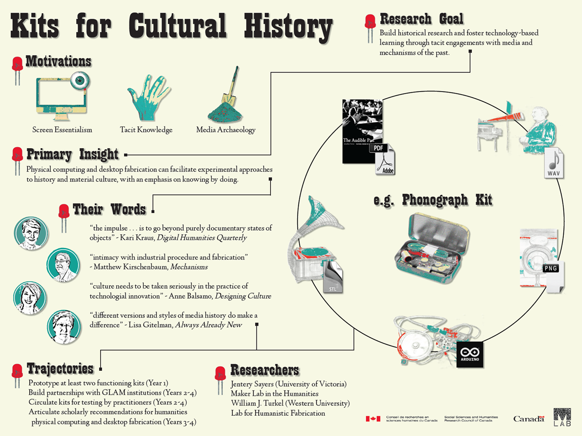 At the CSDH/SCHN conference this year, Nina Belojevic and I exhibited a poster highlighting the early stages of the Lab’s new “Kits for Cultural History” project, conducted in collaboration with Bill Turkel and the Lab for Humanistic Fabrication at Western University. Soon, we’ll publish an overview of the Kits project here at maker.uvic.ca. For now, we’re sharing some brief details, together with a low-resolution version of our CSDH/SCHN poster:
