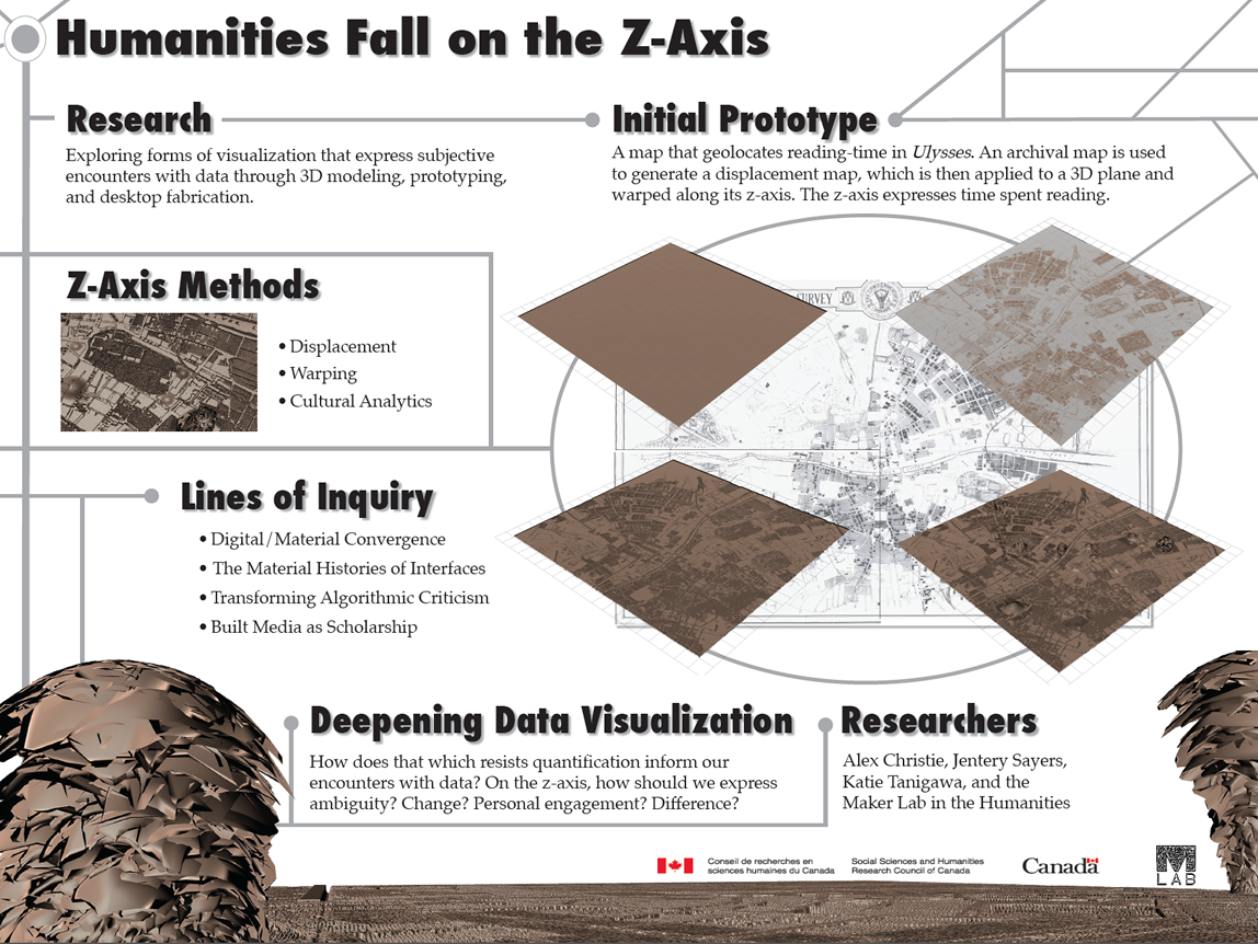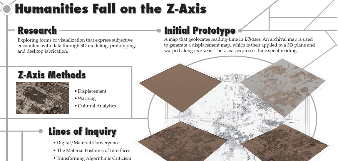 As the poster suggests, the Z-Axis initiative underscores the relevance of subjective encounters with data, with an emphasis on 3D modeling, prototyping, and desktop fabrication techniques. If, as humanities practitioners, we want to express our texts, media, and other cultural artifacts as data, then how are they felt? How are they experienced? What gives them texture? How are they welded or connected to embodied practices like reading and interpretation? Building upon research by Johanna Drucker, Kari Kraus, Mei-Po Kwan, Jerome McGann, Lev Manovich, Franco Moretti, Bethany Nowviskie, Stephen Ramsay, and Lisa Samuels (among others), the project explores speculative articulations of data with context, pushing methods like cultural analytics, programmatic ruination, and algorithmic criticism along the z-axis of data expression—through that third “variable” we in the humanities often use to stress the bodies, perspectives, and technologies that frame or situate otherwise abstract understandings of time and space.