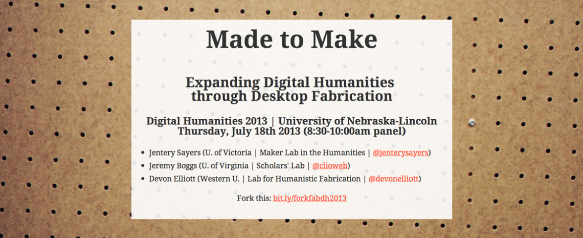 Fab talk about Made to Make: Expanding Digital Humanities through Desktop Fabrication at #DH2013 by @JenterySayers @clioweb @devonelliott