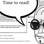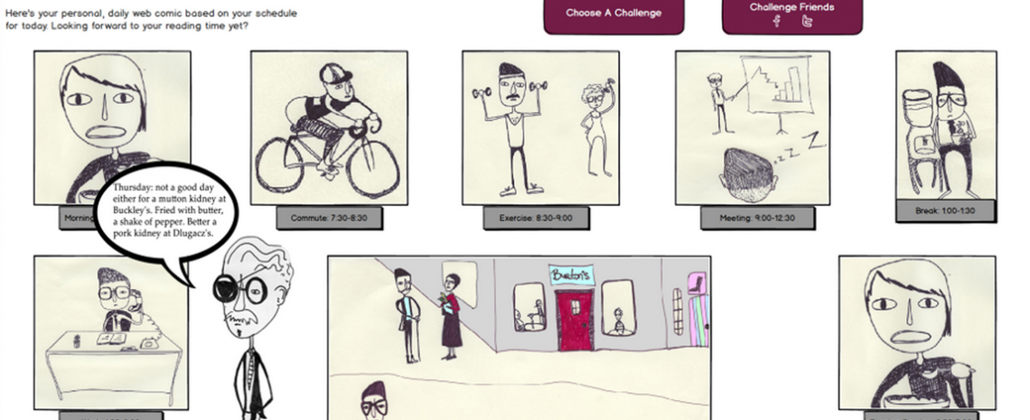 Belojevic and Johnson’s collaborative project, “HyperLit: A Gameful Design Model for a Social Edition,” models a social reading environment that encourages deep attention to literature while also satirically prompting awareness of the digital economy’s tendency toward gamification. For English 507 (Spring 2013), Belojevic and Johnson (both MA students in English) developed a wireframe prototype and a speculative design video that use James Joyce’s Ulysses as a tutor text for their reading environment.