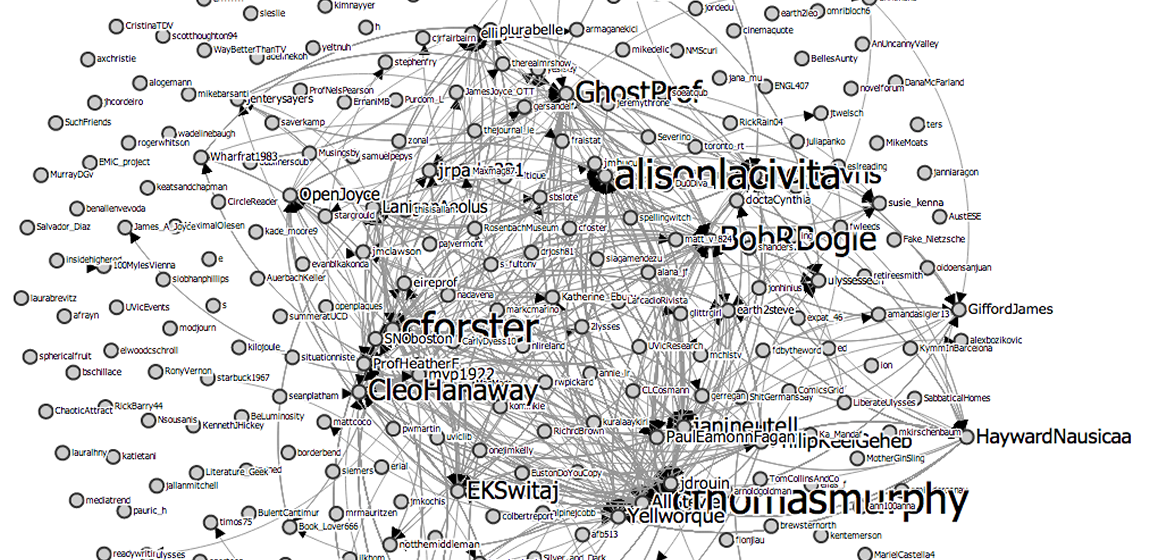 Bewildering, convoluted, unreadable. These are just a few of the adjectives that can be (un)fairly applied, upon first exposure, to both James Joyce’s Ulysses and the above data visualization. Representing the entirety of the #YearOfUlysses Twitter conversation, this visualization will form the nexus of a print volume that compiles, commemorates, and records the Modernist Versions Project’s “Year of Ulysses.” As one can imagine, “porting” a year-long Twitter discussion into print poses considerable design challenges—not least of which being how to accessibly represent the networked synchronicity of the former in the diachronic linearity of the latter. While I could circumvent such challenges by simply mining Twitter for content while ignoring the platform’s formal complexity (as some recent projects have done), I want to eschew such approaches, especially given the modernist sensibilities that inform #YoU. By highlighting Twitter’s form and content equally in my collation of #YoU, I am interrogating the ways that social media can inform or supplement our reading experience of Ulysses.