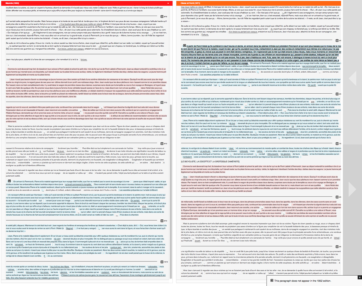 The fragment I encoded describes Jean’s trip to Penmarch during a stormy day. In the original draft pages of the book, Proust wrote two contradictory versions of the trip that were left unrevised. In one version of the passage, Jean travels by car to Penmarch; in another version, he encounters two women and a biker on a train (the biker comes back in a later section of the book). The first published edition of the novel, edited by André Maurios and Bernard de Fallois, argues that Proust intended to join these scenes through the process of revision, excising a paragraph and reordering the two passages such that Jean’s car journey becomes continuous with his travel by train. The scholarly edition of the novel, edited by Pierre Clarac and André Ferré, maintains the separation between these two accounts, preserving a fractured, contradictory, and unfinished narrative.