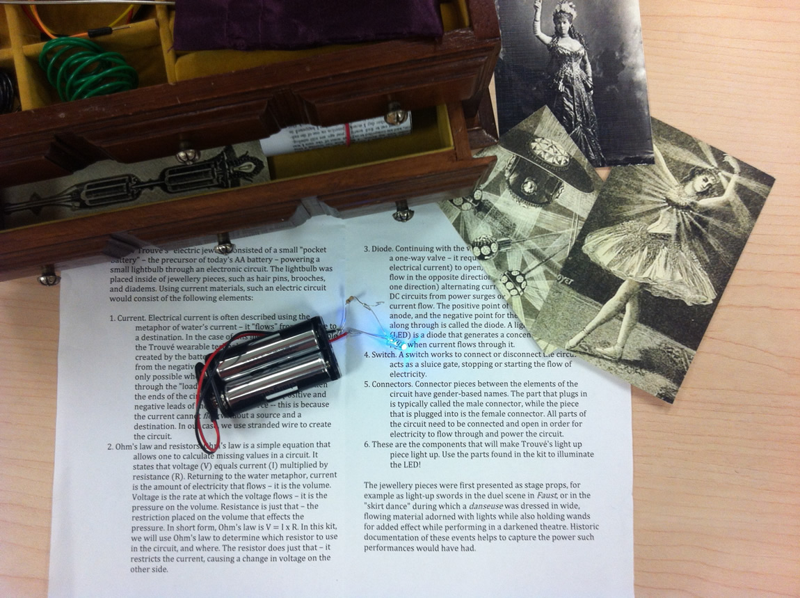 For now, then, we are calling this kit our “early wearables” kit. It contains the parts required to construct a simple, battery-powered circuit that uses a small LED to illuminate a filigree hairpin. We also included supplementary materials, including pictures of women modelling Trouvé’s pieces, a handbill for a production of Faust (for which Trouvé created light-up swords), and instructional materials that explain the basic principles of circuitry. The instructional materials describe the functions and cultural significance of the parts in the kit, encouraging audiences to explore the historical contexts and discursive elements of early wearables.