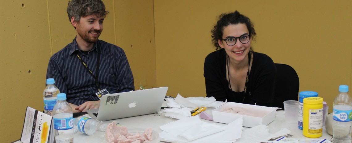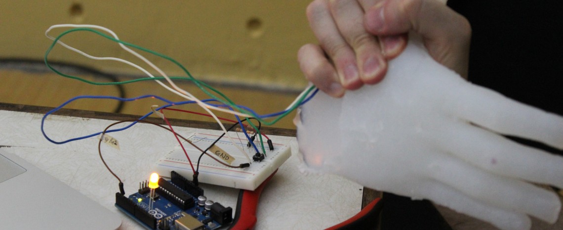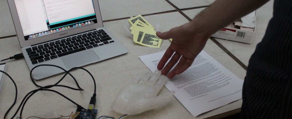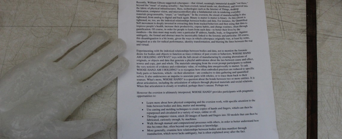 The admittedly experimental theme of the popup makerspace was, “Whose Hand Am I Holding Anyway?” We used the space’s temporary infrastructure to draw public attention to the intricate relationships between bodies, data, immediacy, and distance in a “global” digital economy. We first cast hands in plaster and then—with anyone who stumbled upon the space—created silicon proxies of those hands. The proxies were embedded with sensors, and later in the conference we wrote an Arduino sketch to not only log when the sensors were triggered but also display messages via a serial readout. Conference participants could shake hands with these rather defamiliarizing proxies, an often amusing encounter that was immediately confirmed on a screen in the space. The handshake data was then logged so that we’d know, by the conference’s conclusion, how many people the proxies had “met.”