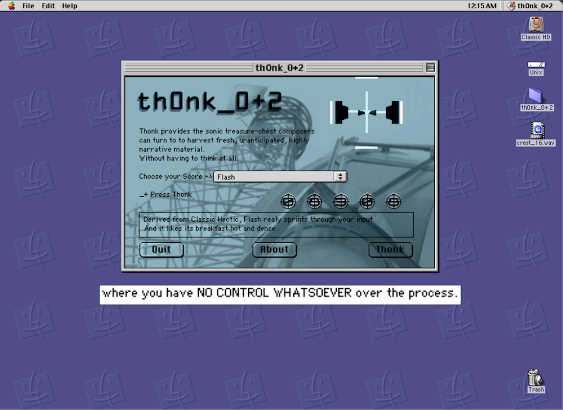 In the interest of saving my model from spinning in a void, emulation became an increasingly crucial factor in simulating microsound. I searched personal directories to find any granular synthesis software from the mid-1990s. My original assumption was that real-time programs enforced the representation of the sound particle as an ontological entity rather than a set of rules and procedures; that is, until I encountered Th0nk (released in 1995), which is a non-real time granular synthesizer. Rather than traversing a field of evolving sound, the user inputs a sound file , which is then processed and outputted for later listening. Yet, Th0nk’s rhetoric feels both prescient and parodic with regard to the rhetoric of later microsound: the manual promises the thrill of “NO CONTROL WHATSOEVER” and the ability to “to harvest fresh, unanticipated material . . . without having to think at all.” Here, as an end-user, the microsound artist enters the marketplace of “digital detritus.”