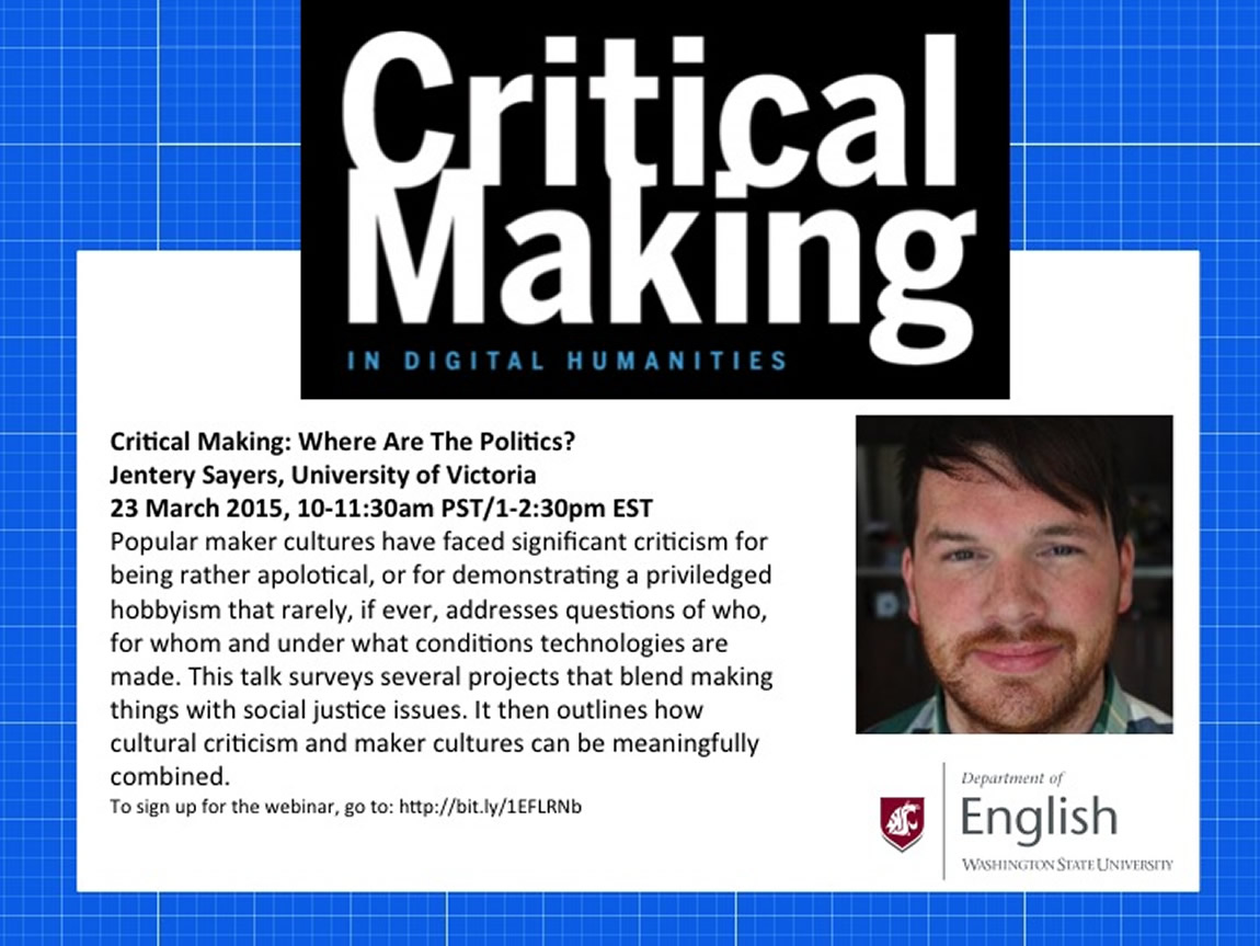 Today, for Roger Whitson‘s “Critical Making in Digital Humanities” series, I spoke for about an hour on the politics of making, with an emphasis on computer vision, hardware, and community makerspaces/hackerspaces. I believe the talk was recorded. If it’s published online, then I’ll add the URL here. In the meantime, below is the poster Roger made for the event. Thanks, Roger! It was an absolute pleasure. (Next time, I’ll spell-check my abstract. Sorry!)