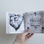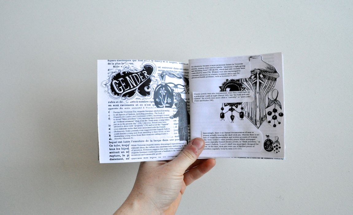 Inspired by grangerizing as well as Visconti’s notion of book hacking, we used Georges Barral’s biography of Trouvé, Histoire d’un Inventeur, as the base text for our early wearable guide. Since we could not work from a hardcopy of the biography, we instead printed a public domain PDF. We then used Victorian illustration styles to create something between a grangerized book and a zine. Zines usually represent subcultures or ideas that are not generally acknowledged in popular publications. Thus it seemed fitting to use the zine format to represent an inventor who, despite his numerous inventions and contributions to Victorian culture, remains minimally referenced in scholarly work. Some of our design influences include riot grrl weekly zines, various punk zines from the 1970s, ’80s, and ’90s, and Anna Anthropy’s videogame work, all of which combine forms of cultural criticism with experimental media.