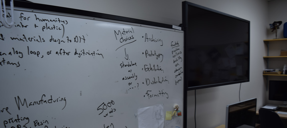 If you enter the MLab’s prototyping lab, it will likely strike you as quite similar to most digital humanities labs. There are computer workstations, displays, whiteboards, scanners, and office chairs on casters. (See Figure 1 below.) In this sense, doing digital humanities in the MLab is digitizing material, modeling and encoding it, and sharing it.
