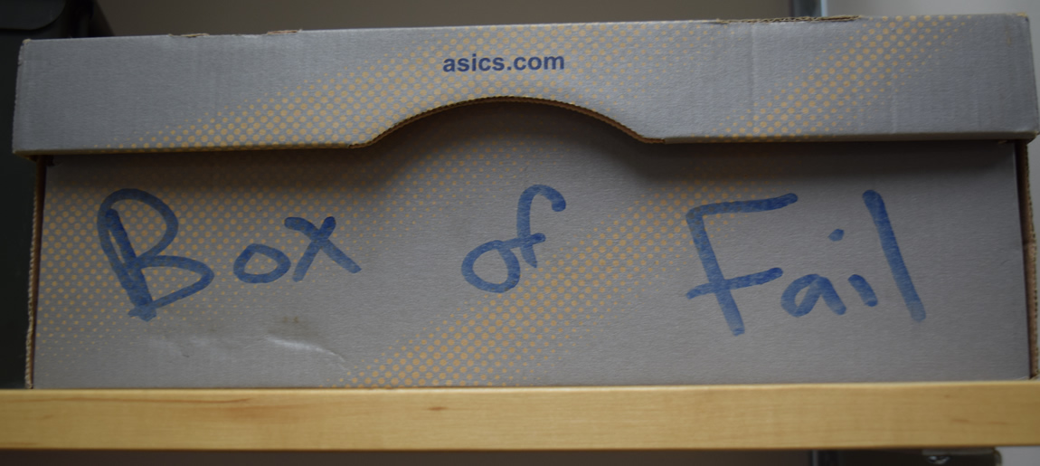 The MLab is also a place for storing our sketches, drafts, iterations, and hiccups in, for example, a box of fail. (See Figure 4 below. Boxes of fail are common in makerspaces.) Researchers need somewhere to put their middle states, which are also conversation pieces when people visit the lab: “We tried this idea, but we didn’t anticipate . . .” “We thought it would work until we built it. Then we learned . . .” Storage overlaps with rumination. Materiality intersects with learning and literacy. To do digital humanities is to archive, revise, and reflect (tho, to be fair, I’m using “archive” rather loosely here).