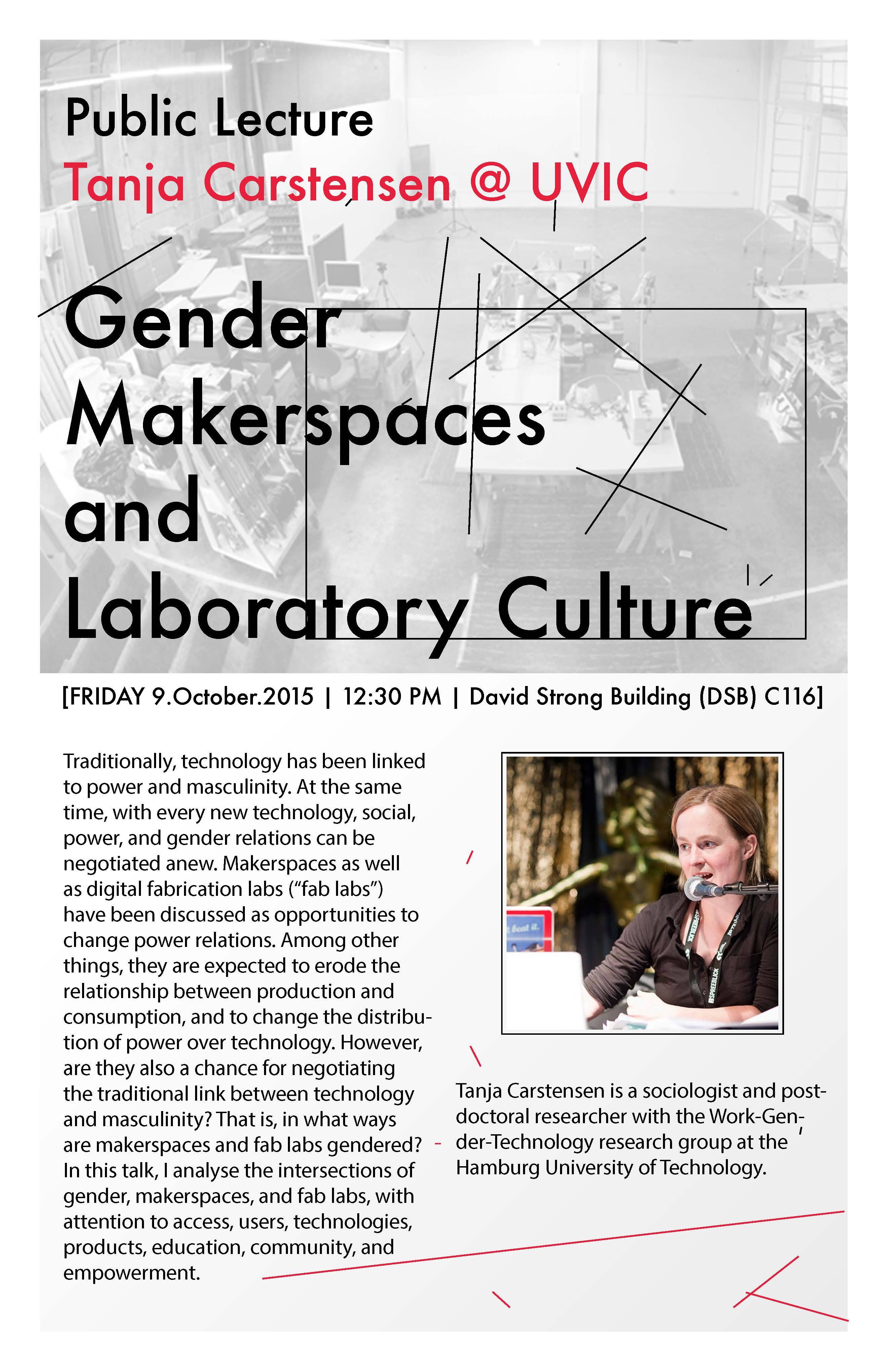 The MLab is very happy to welcome Tanja Carstensen to UVic. On Friday, October 9th at 12:30pm in David Strong C116, she will be delivering a talk on the topic of “Gender, Makerspaces, and Laboratory Culture.” Details and poster below. We hope to see you there. We are fortunate to have Dr. Carstensen on campus, and after her talk we plan to dedicate at least twenty minutes to discussion.