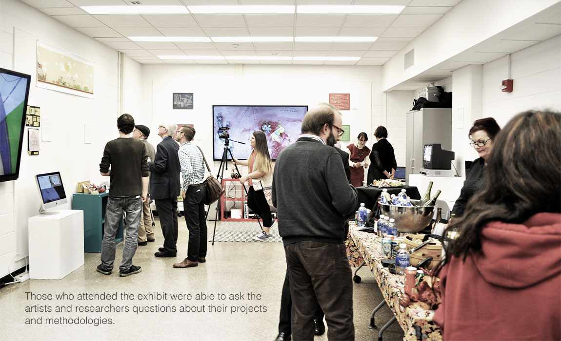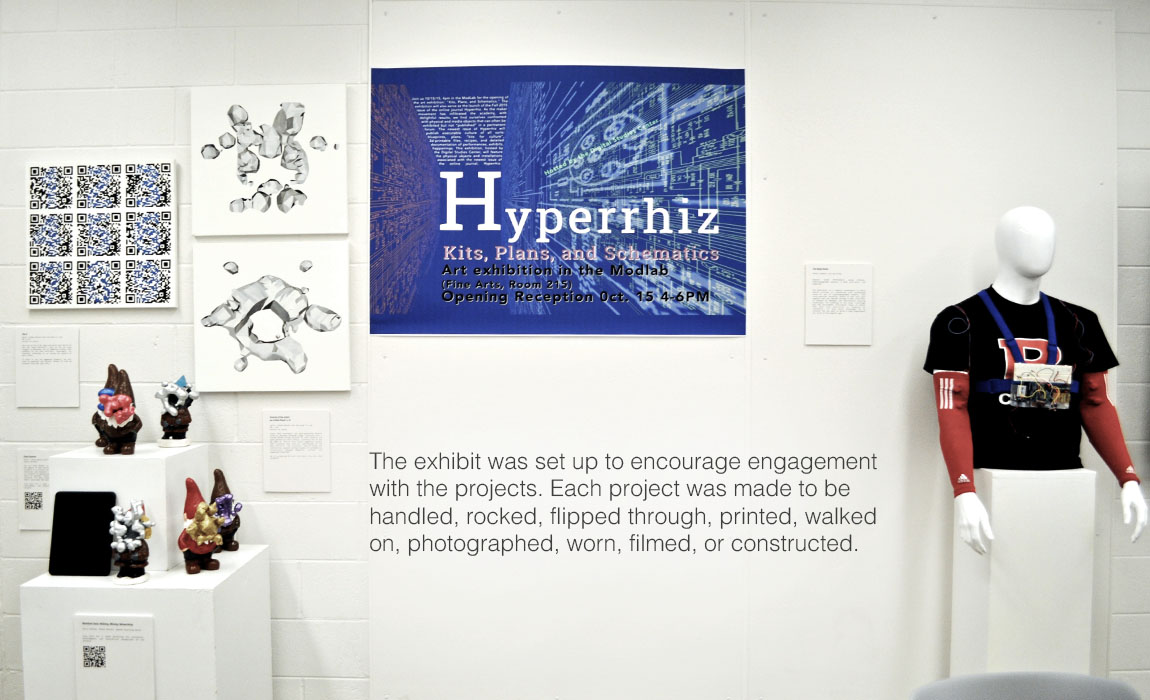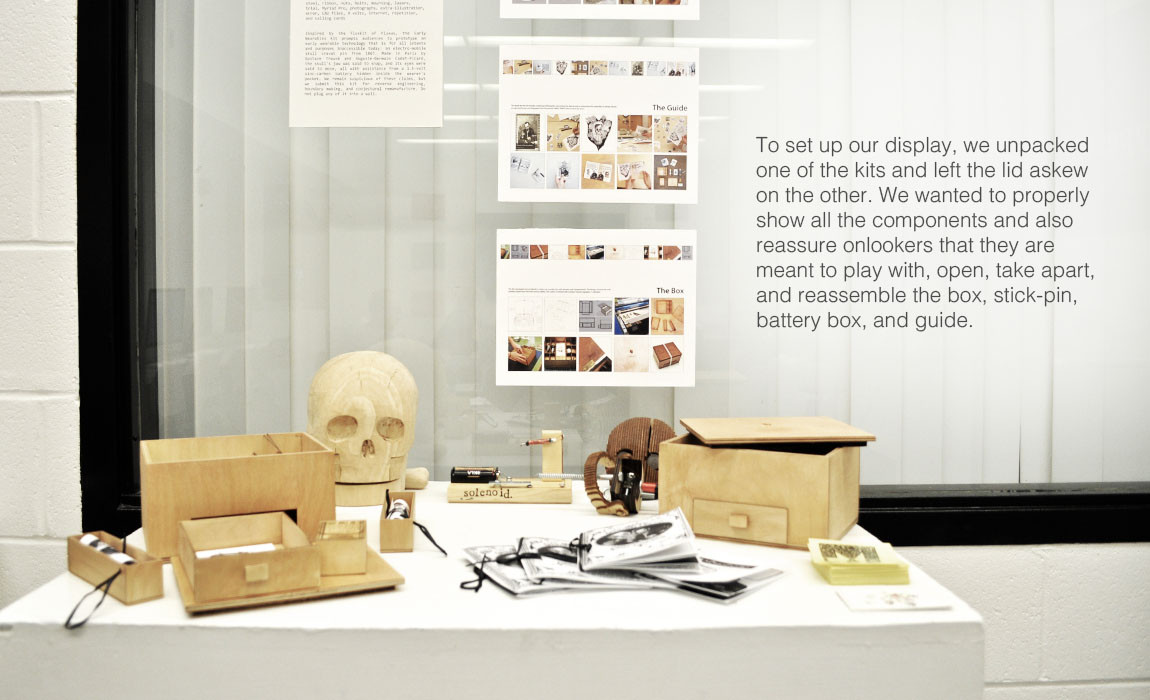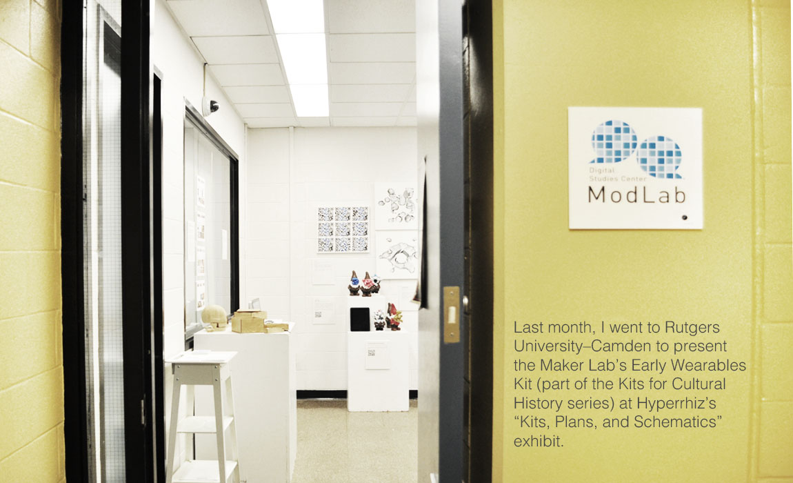 Last month, I went to Rutgers Unviersity-Camden to present the Maker Lab's Early Wearables Kits (part of the Kits for Cultural History series) at Hyperrhiz's "Kits, Plans, and Schematics" exhibit.newexhibitThose who attended the exhibit were able to ask the artists and researchers questions about their projects and methodologies.As researchers, we gained alternate perspectives on the Early Wearables Kits by observing participants as they explored each component and asked questions about historical particulars and our prototyping process.Image 6, Rutgers exhibit