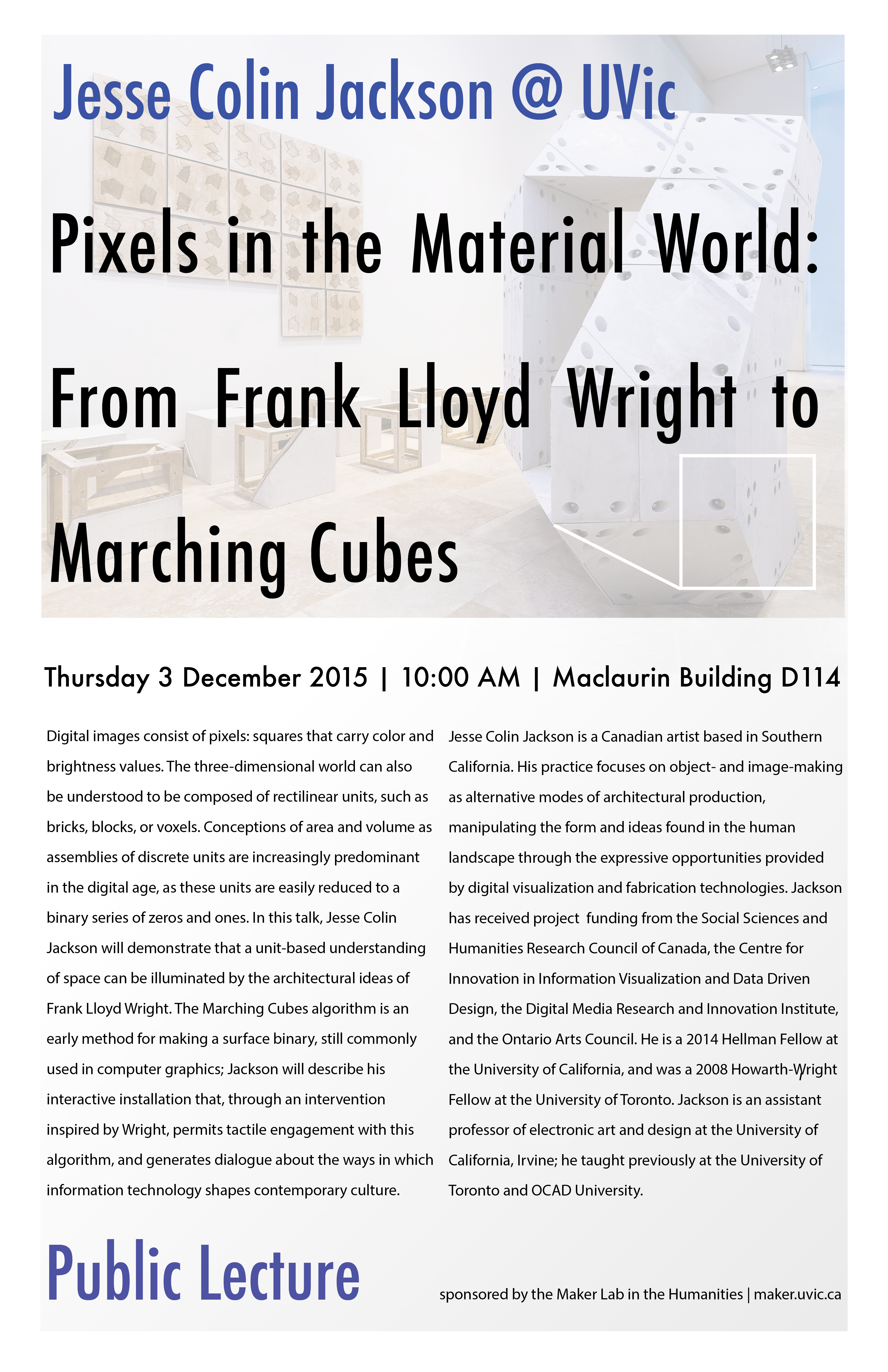 The MLab is delighted to announce that Jesse Colin Jackson (Electronic Art and Design, University of California, Irvine) will be delivering a public lecture on campus next week. Scheduled for 10 a.m., Thursday, December 3rd, in MacLaurin D114, the lecture is titled, “Pixels in the Material World: From Frank Lloyd Wright to Marching Cubes.” We hope to see you there! Details below.