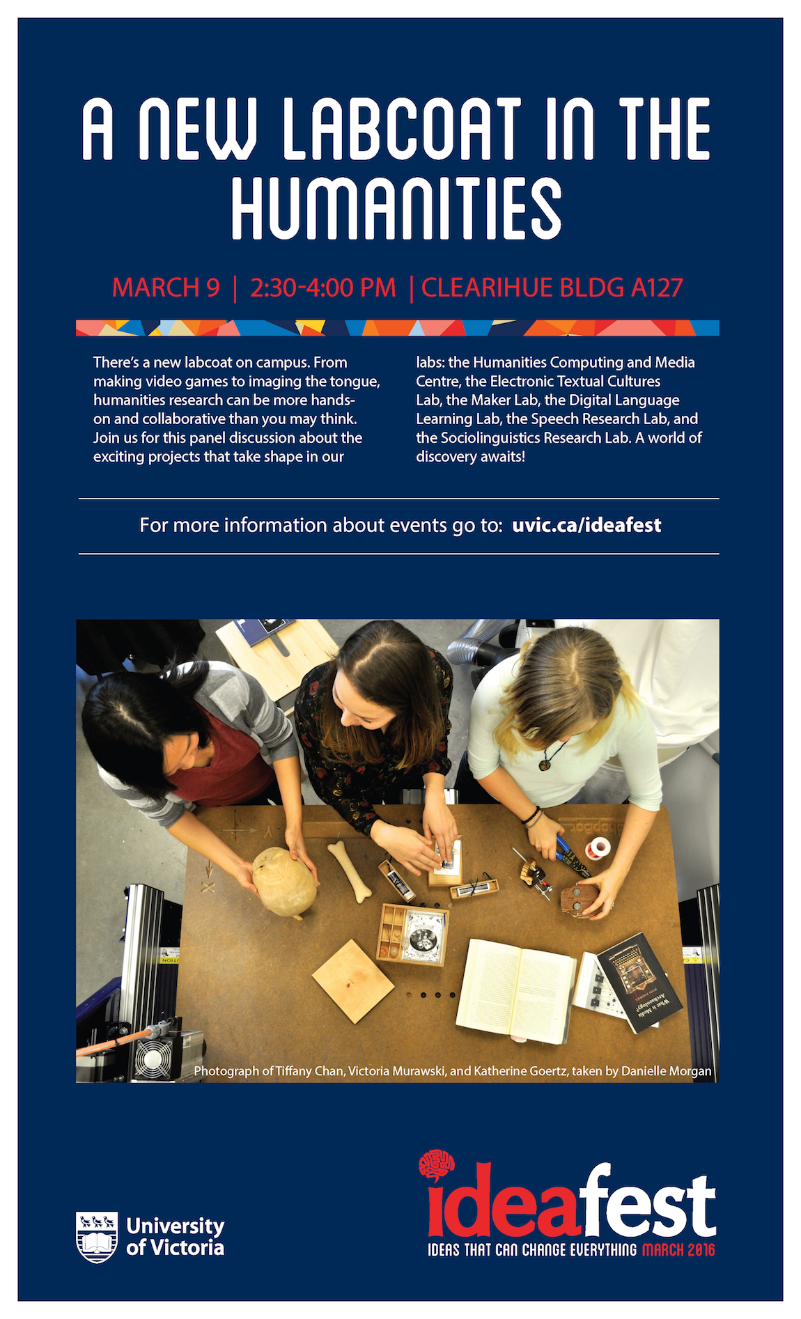 Tomorrow (Wednesday, March 9th)—with colleagues from the Humanities Computing and Media Centre, the Electronic Textual Cultures Lab, the Digital Language Learning Lab, the Speech Research Lab, and the Sociolinguistics Research Lab—I’ll be presenting during “A New Labcoat in the Humanities,” an IdeaFest 2016 event scheduled for 2:30-4:00pm on the UVic campus. A brief description of the panel, as well as a poster, are below. Hope to see you there!