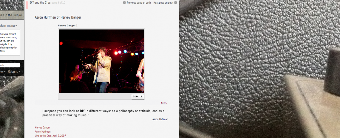 I keep returning to the notion of access, which, as an ethos, guides nearly every aspect of this project—from Jim Anderson’s creation and donation of the Croc Collection (as a way for music fans to access materials related to a specific part of Seattle’s history) to questions of design relating to the exhibit itself. For example, accessibility has dominated my questions about the design of the interface: how will users—whose primary reasons for visiting the exhibit may be to access either the exhibit’s media or narrative content (or both)—interact with the site? How will their options for navigation affect their experience of the exhibit? And conversely, how do you make an exhibit narrative meaningful for the media-centric user?