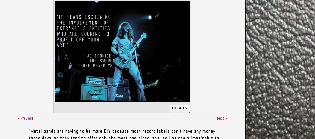 This again begs the question of audience, but it also involves a discursive relationality between design and use; in order to contextualize the significance of the collection, it is important that media and narrative point to each other. In other words, the media, both of the site itself and what the site points to, is less meaningful without the context provided by the narrative. Conversely, the narrative is illustrated in a meaningful way by the various ways in which the user can interact (or access) the media as they read through the site. To this end, I’ve started looking at public sites with similar media content, such as allmusic.com (which has narrative, visual media, and short audio clips), in an attempt to better understand how the interplay between media informs the user’s experience.
