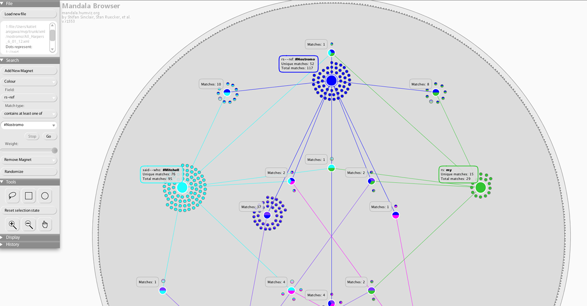 To begin addressing these questions, I’m imagining an article in an online publication like DHQ or NANO that would articulate a particular argument, and—instead of providing static images of data visualizations—it would embed a rich-prospect browsing interface (RPBI) like the Mandala browser into the argument itself. The data used in the article would be loaded into the browser, and audiences would be asked to play with that data, which the journal could also make publicly available (perhaps in various formats). For a first-year PhD student new to digital humanities, this possibility is both exciting and a bit terrifying. Among other things, this model is just begging for people to disprove, or at least rigorously test, your article’s claim and its corresponding data. Who wants a “break” button built into their scholarship?