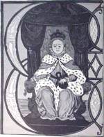 A young queen Elizabeth is pictured as part of an ornamental letter"E." Reproduced in J.R.Green, A Short History of the English People (1900). University of Victoria Library.
