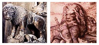 The medieval sculptor had probably seen lions only in bestiaries*; the seventeenth century artist of the pen and ink drawing on the right captured both a more accurate image of a lion (lions were kept in the Tower of London) and the drama of the imagined encounter with attacking hounds. (Another painting of hounds on the attack.)