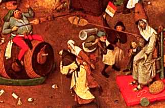 Country people, their festivals and their sufferings*, form the human focus of most of his paintings. In the northern tradition, both his human figures and his landscapes are closely observed, and there is little tendency to idealize them--as the picture here with a Falstaffian Carnival attacking the thin old woman Lent with a giant shishkebob shows.