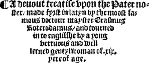 One such translator was Margaret Roper*, daughter of Sir Thomas More. She corresponded with the great humanist and friend of the family, Erasmus, who considered her the "ornament of Britain." Her published work was a translation of a work by Erasmus, A Devout Treatise upon the Paternoster;* in one of her father's letters there is mention of poems she had written, but they have not survived-- they were probably written in Latin, and may also have been translations.