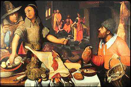The illustration here is of a Biblical subject, the relationship between Martha, the homely woman who kept the house running, and Mary of Magdala* whose impulsive act in anointing Jesus with ointment receives much attention from the Gospels*. This painting is unusual in putting Martha in the foreground.