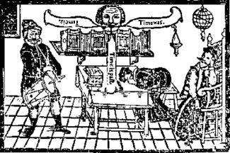 In this composite scene from Greene's play Friar Bacon and Friar Bungay, the brazen head speaks, "Time is. Time was. Time is past," while Friar Bacon and his servant sleep. A Kempe-like clown (from a different scene) is on the left.