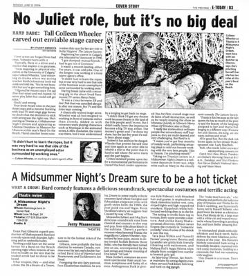 Description | Derdeyn, Stuart. "Sealed with a Kiss: Colleen Wheeler Did TV and Film but Returned to Theatre with Amazing Results. She and Scott Bellis Star in A Midsummer Night's Dream." The Province 12 June 2006: B3. |