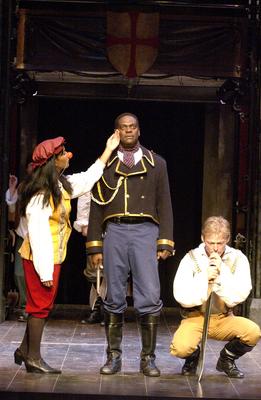 Description | (L to R) Carolyn Roberts as a boy, Johnny Lee Davenport as Exeter, and Allyn Burrows as King Henry V. Photographed by Kevin Sprague. |