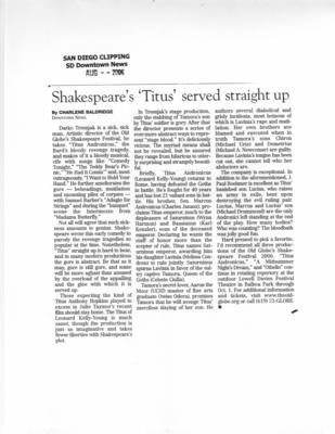 Description | Baldridge, Charlene. "Shakespeare's 'Titus' served straight up." SD Downtown News Aug 2006. |