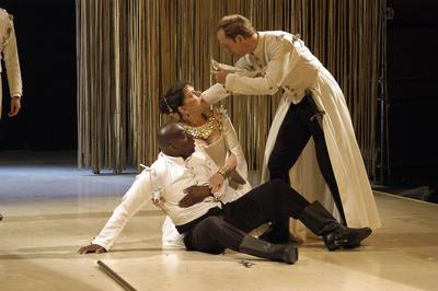 Description | (L to R) John Douglas Thompson as Edmund, Ariel Bock as Goneril, and Daniel Sherman as Albany. Photographed by Kevin Sprague. |