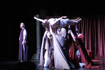 Description | Mark Woollett as Brutus (left), Curt Klump as Julius Caesar (raised) and the conspirators. Photographed by Kevin Sprague. |