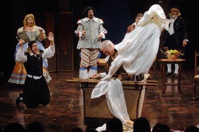 DescriptionMichael Hammond as the jealous Master Ford (center) looks for his wife's lover. (L to R) Robert Biggs as Sir Hugh Evans, Elizabeth Aspenlieder as Mistress Ford, Jonathan Croy as Dr. Caius, David Furumoto as Master Page, and Mel Cobb as Justice Shallow. Photographed by Kevin Sprague.