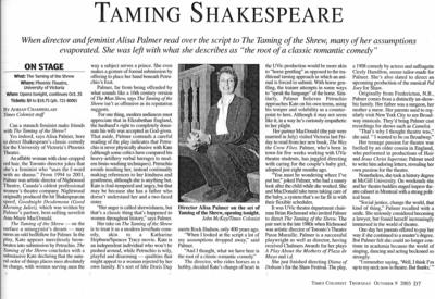 Description | Chamberlain, Adrian. "Taming Shakespeare." Victoria Times Colonist 9 October 2003. |