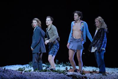 DescriptionAdina Vetter as Helena, Patrick O. Beck as Demetrius, Philipp Hauß as Lysander, and Pauline Knof as Hermia. Photo: Reinhard Werner.