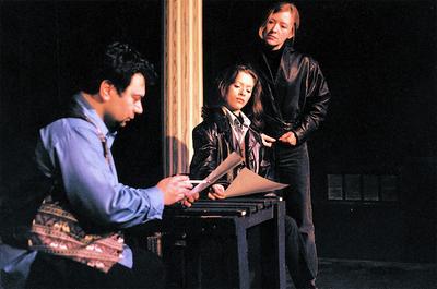 Description | Mark Antony (Tom Anastasios), Octavius Caesar (Barbie Cooke) and Lepidus (Bonnie Gray) discuss which Senators should die. Photographer: Kathy Plamondon, April 2000. |