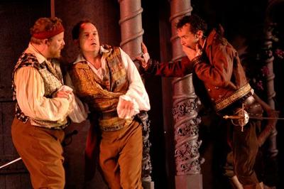 Description | Matt Rapport as Benvolio, David Fritts as Mercutio and Nathan Darrow as Romeo in the Heart of America Shakespeare Festival's 2007 production of Romeo and Juliet. Photo by: Doug Hamer. |