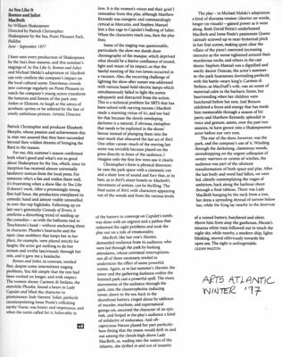 Description | Walton, Glenn. "As You Like It / Romeo and Juliet / Macbeth." Arts Atlantic Fall/Winter 1997: p.49-50. |