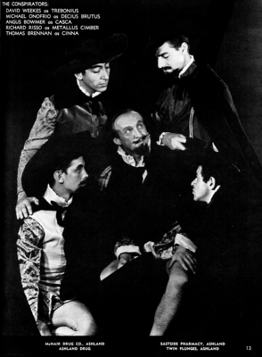 Description | Photo: The Conspirators: David Weeks as Trebonius, Michael Onofrio as Decius Brutus, Angus Bowmer as Casca, Richard Risso as Metallus Cimber and Thomas Brennan as Cinna. |