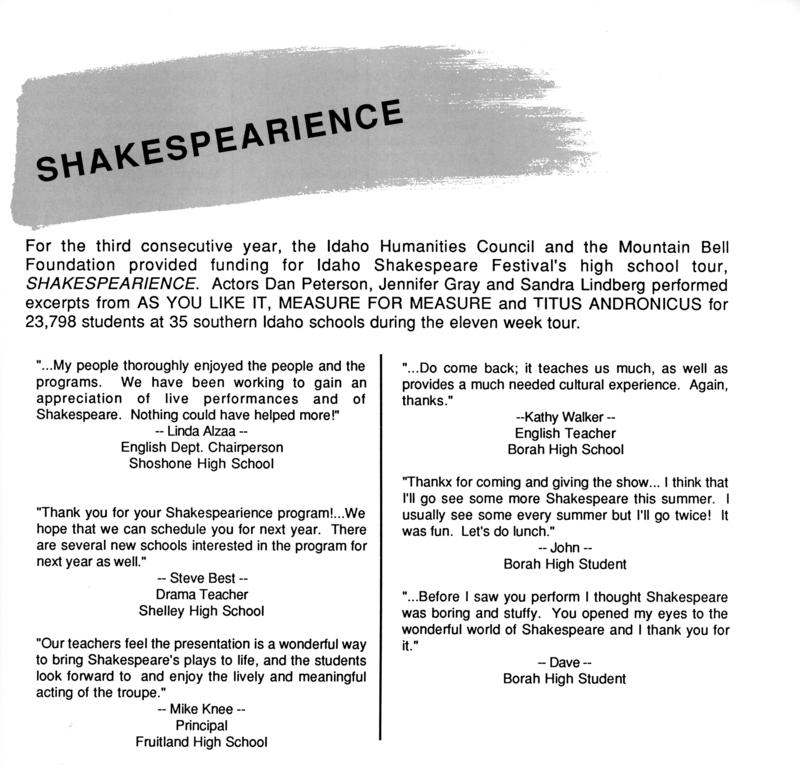 | Rights | Artifact © Idaho Shakespeare Festival [web site] |