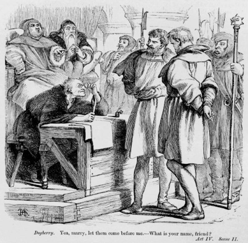 Description | Dogberry: Yea, marry, let them come before me.-- What is your name, friend? Illustrator: H.C. Selous, c. 1830. |
