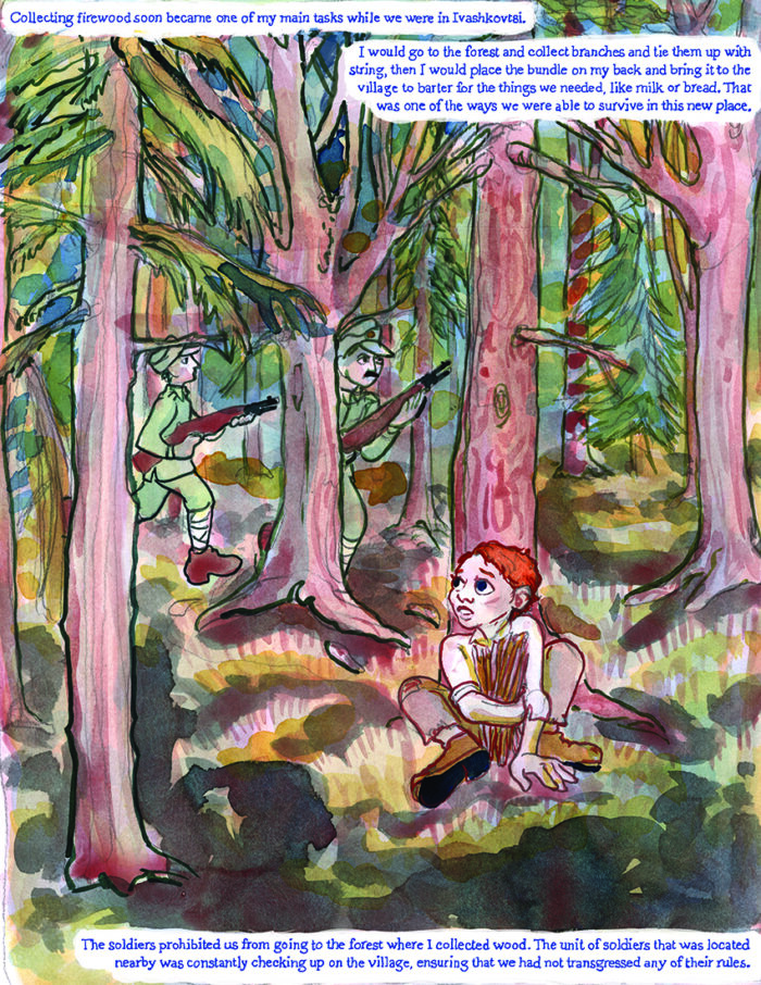 My overall aim was to create an interdisciplinary unit that could be used in a variety of classrooms in the humanities, and possibly beyond – from social studies to English to art. Making use of the impressive narrative power of the text that Libicki developed with Schaffer, I hoped to give learners an opportunity to themselves become imaginative, empathetic, and respectful witnesses to the testimony of victims of the Holocaust. I’m excited to see what kind of outcomes teachers across the country achieve when these lessons are piloted. The brilliance of Libicki’s memoir, for me, can be summed up in a resonant splash panel on page fourteen, where the choices, fears, and possibilities of Schaffer’s life are put on vivid, elemental display in the forest. The timelessness of his story has been brought to life.