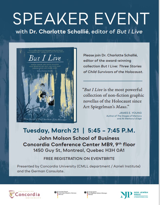 Concordia’s Department of Modern Languages and Linguistics, and the Azrieli Institute have invited Dr. Charlotte Schallié to discuss her award-winning book, ‘But I Live: Three Stories of Child Survivors of the Holocaust’. She will speak to the role of the visual arts in Holocaust education, the importance of survivor-centred storytelling practices and trauma-informed approaches to ethical testimony collection, as well as the urgency of preserving survivor experiences.