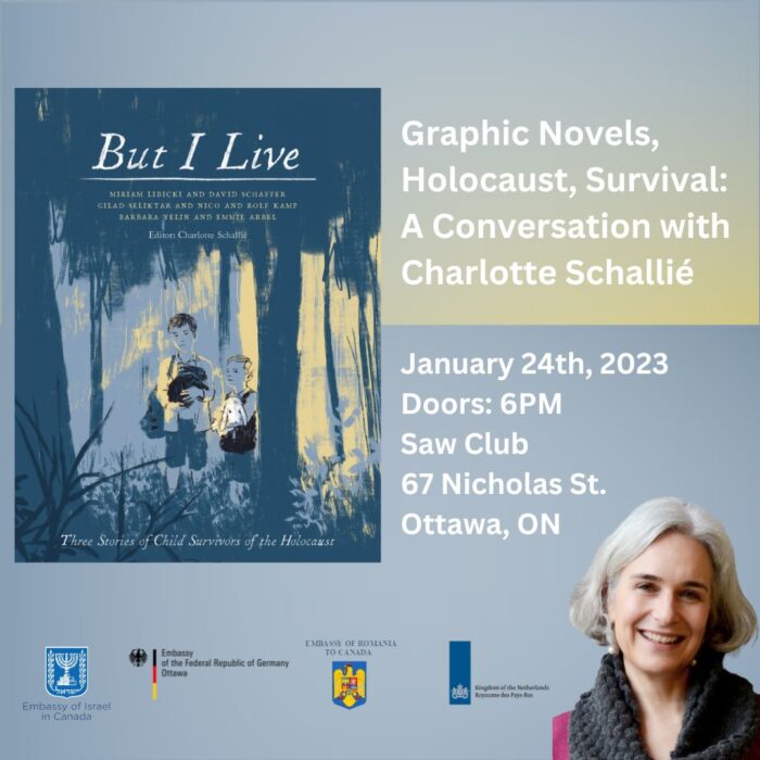 Event description: But I Live: Three Stories of Child Survivors of the Holocaust, edited by Charlotte Schallié is a powerful collection of non-fiction ‘graphic novellas’ that deal with the Holocaust. The book has won the Canadian Jewish Literary Award for Biography. But I Live sketches autobiographical stories by Holocaust survivors Emmie Arbel, Nico and Rolf Kamp, and David Schaffer, co-created with visual artists Miriam Libicki, Gilad Seliktar, and Barbara Yelin.
