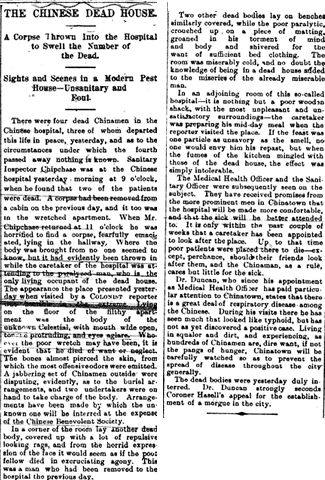 | The Chinese Hospital The Chinese hospital was seen as a necessary establishment for the Chinese immigrants in Victoria. Western medicine did not appeal to the Chinese people because they were accustomed to using Chinese herbs, which were not available in the regular hospitals. One of the main goals of the Chinese Consolidated Benevolent Association was to care for the sick and poor, that had no one to turn to in Canada for assistance. These individuals were provided accomodation in a “small wooden hut” that acted as a hospital. It was labelled Taipingfang, meaning “peaceful room.”24 Rather than a hospital used to provide treatments, this little shack was used for the sick and poor to rest, be fed, and stay warm. It also served as a location where the sick and poor could die in peace. One individual, referred to as the caretaker, did everything in the Taipingfang. The caretaker cleaned, prepared meals and medicine/herbs, and removed the dead bodies. Because only one caretaker could function at a time in this small space, the “hospital” often got run down. One reporter published an article in the Daily Colonist of the horrible conditions. The Daily