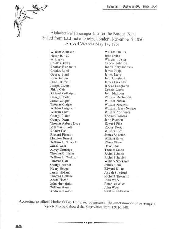 The passenger list of the Tory indicates only the male family heads and not the women and children who were also on board. The most recognizable name on the list is John Work (not to be confused with the curiously similar John Wark, also apparently on board - we suspect that this may be the same person), a prominent farmer and legislator. Also aboard was Martha Cheney, whose diary is an excellent source on early Victoria.